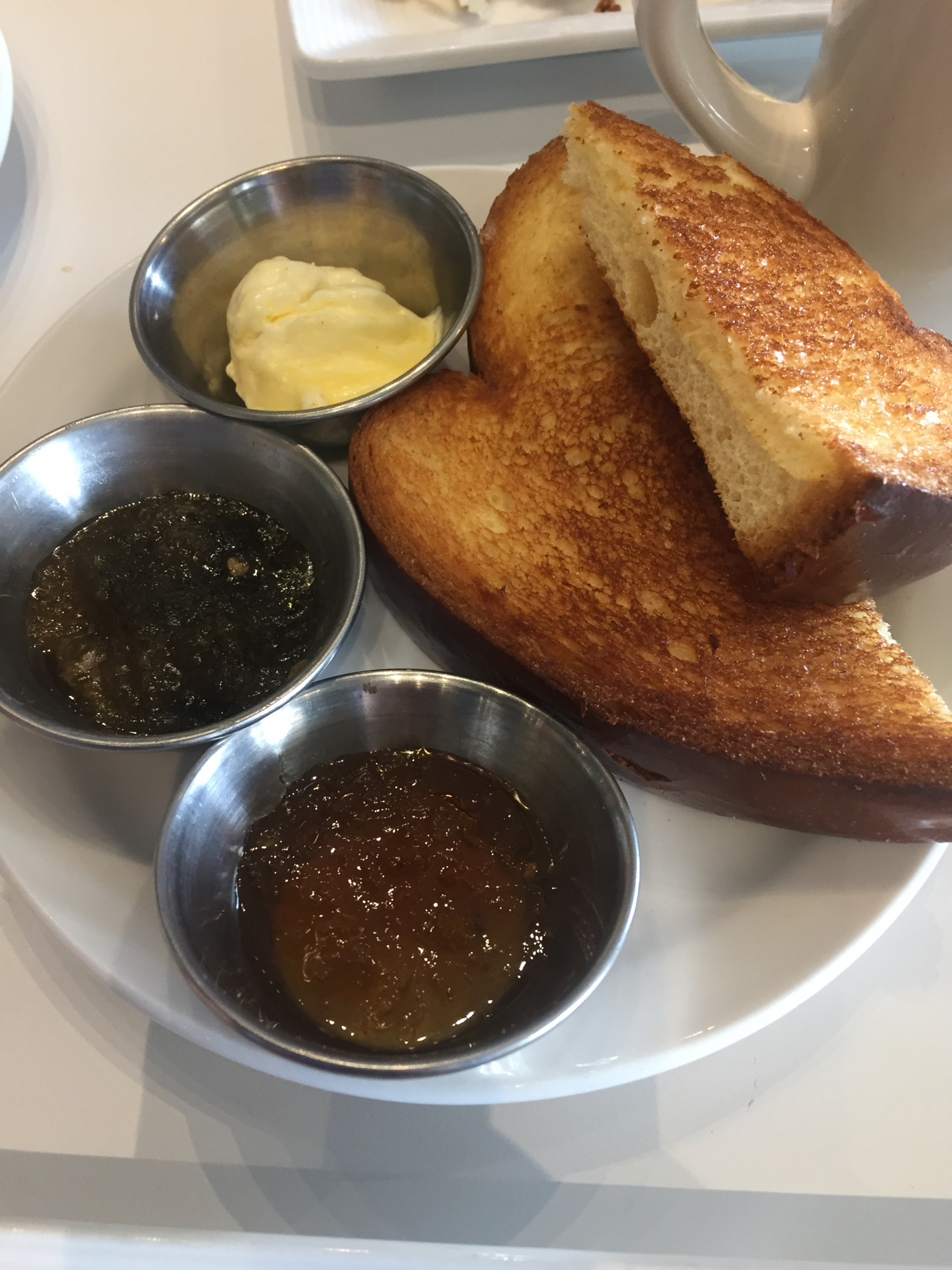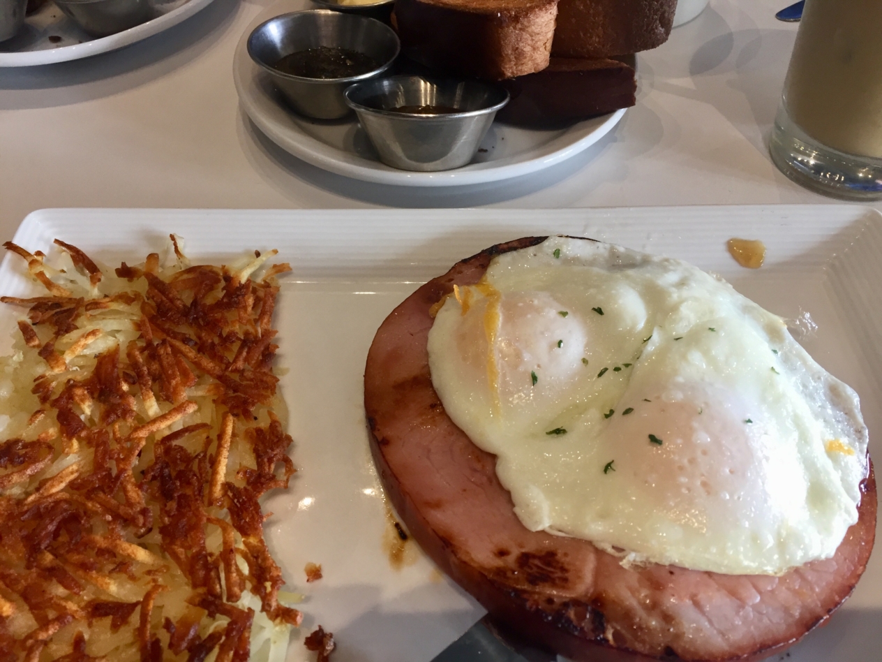 We both had the recommended ham steak with redeye gravy as seen on Diners, Drive-ins and Dives. It was a bit too salty for my liking but the housemade jams of jalapeno and pineapple where a hit!